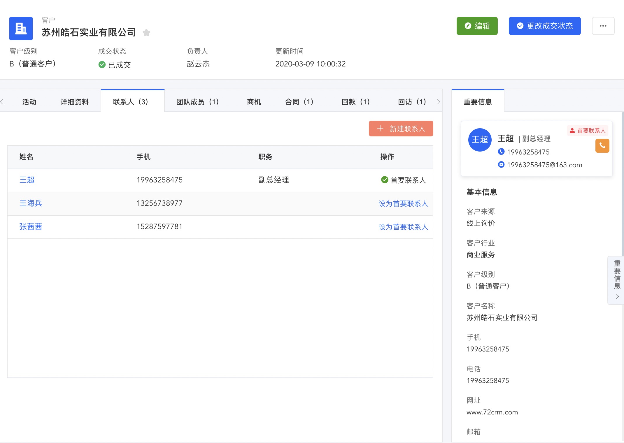 每个客户可以建立多个联系人信息,系统可以将联系人进行分类,快速识别重要决策人。