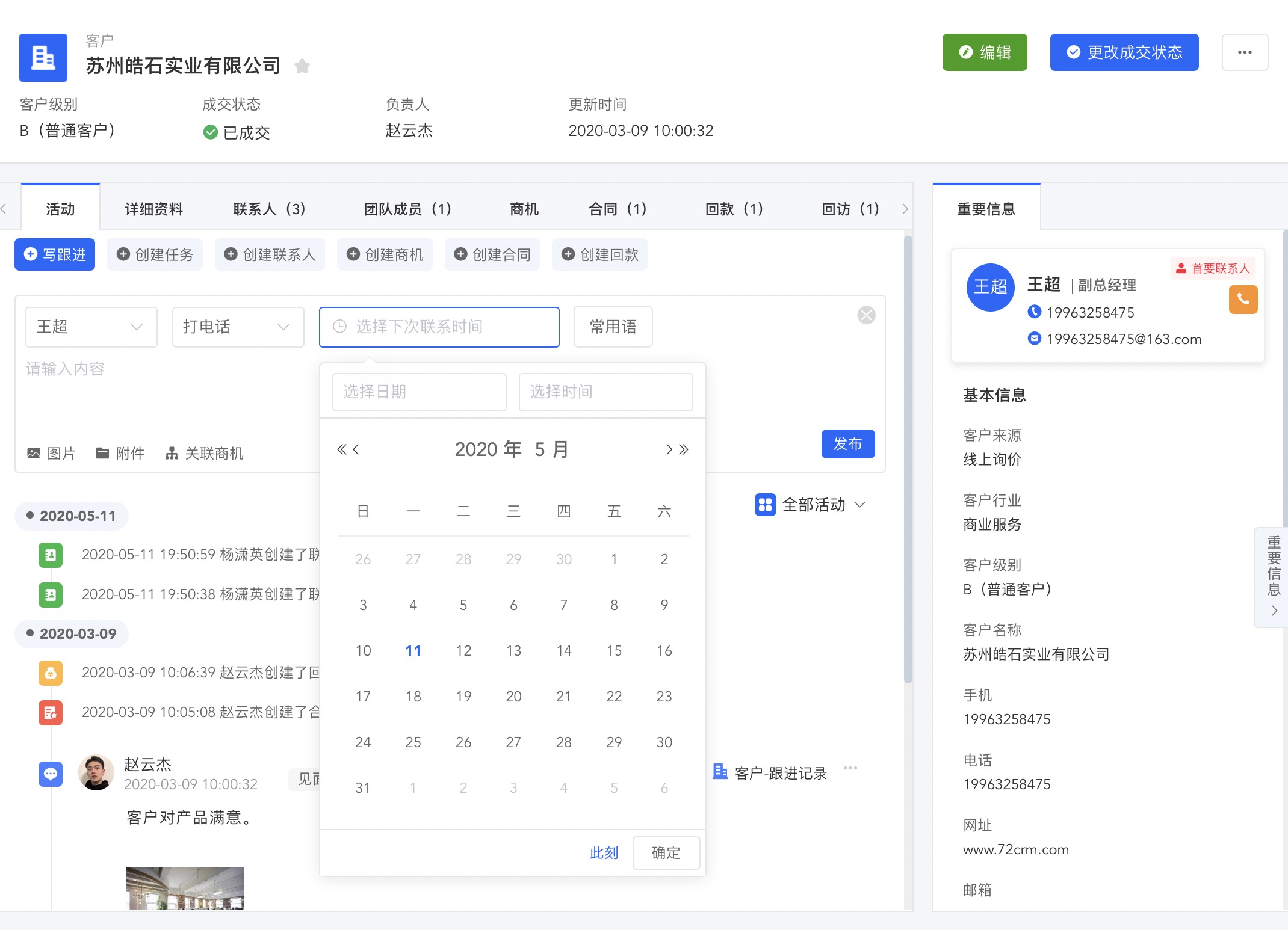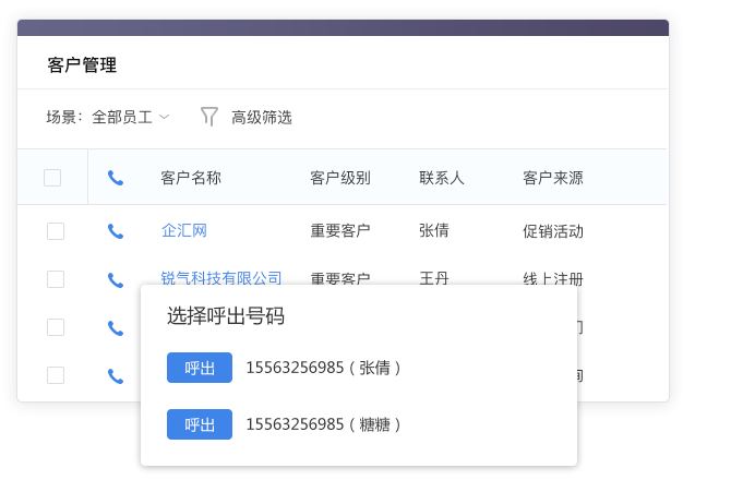 CRM 中直接拨打电话,快速全面地了解客户情况,提升客户体验。