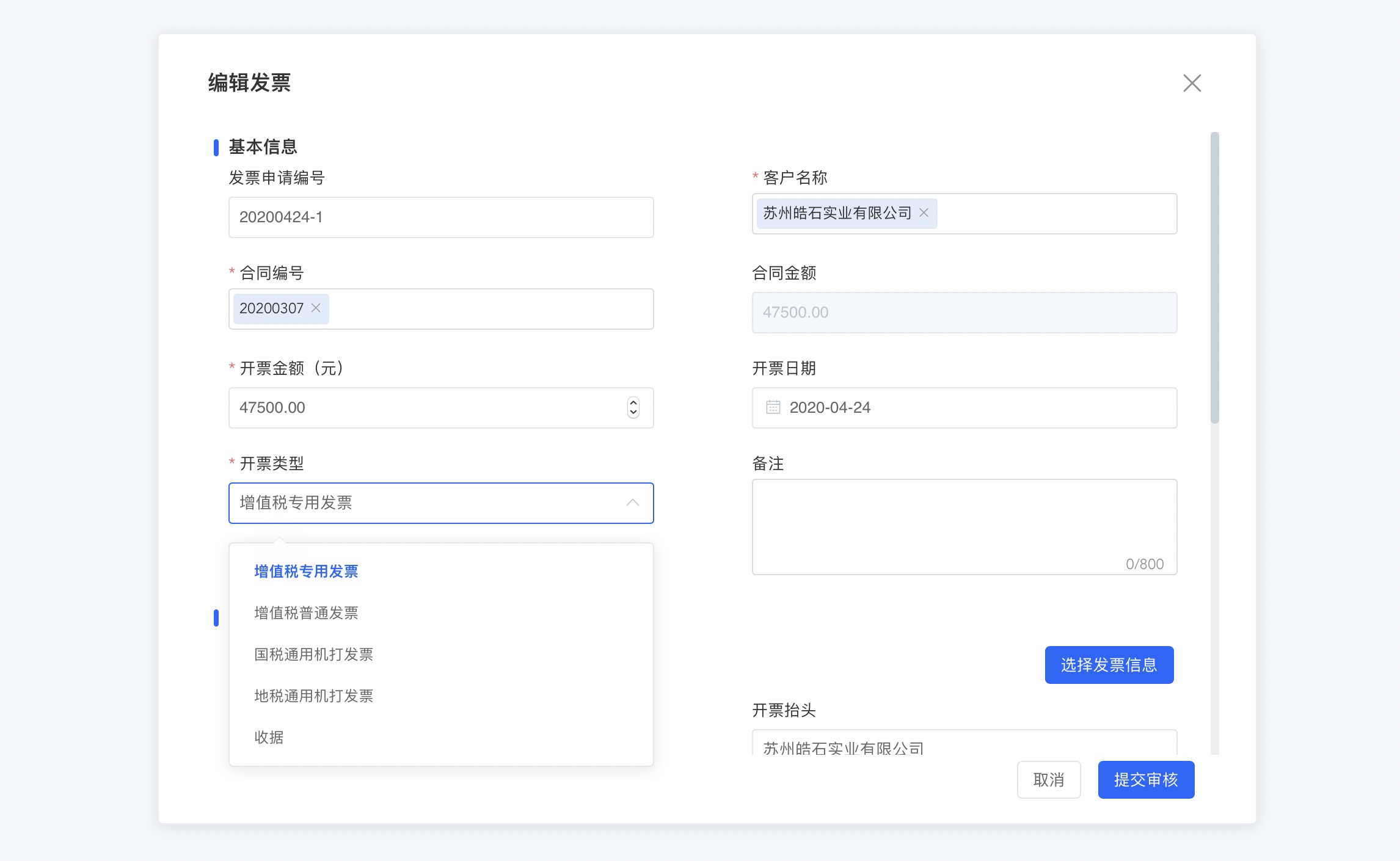 发票模块可以对接悟空CRM财务系统,实现财税管理一体化。