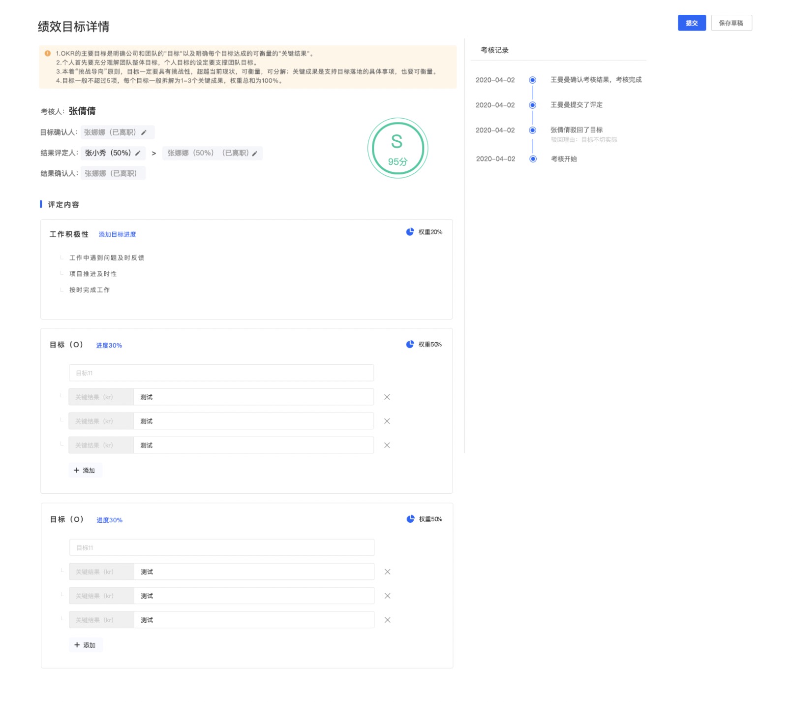 支持OKR、KPI两种考核方式,预设或自定义考核模板,贴合业务状态,支持多种考核方式,选择更自由。
