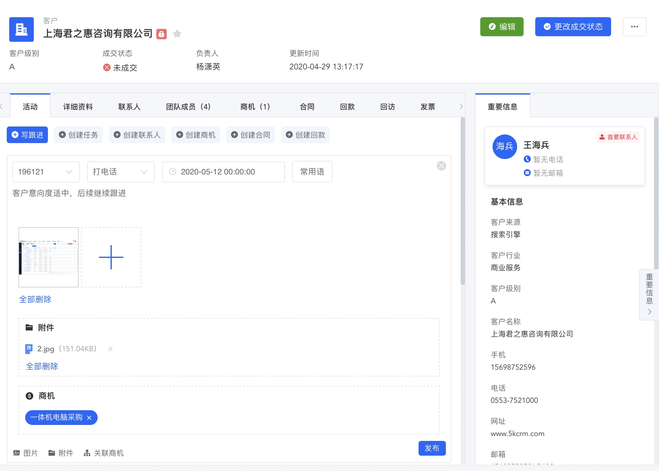 随时随地联系客户,反馈跟进情况并建立下一步联系计划;添加客户外部动态,了解客户需要,及时联系维护,促成二次合作。