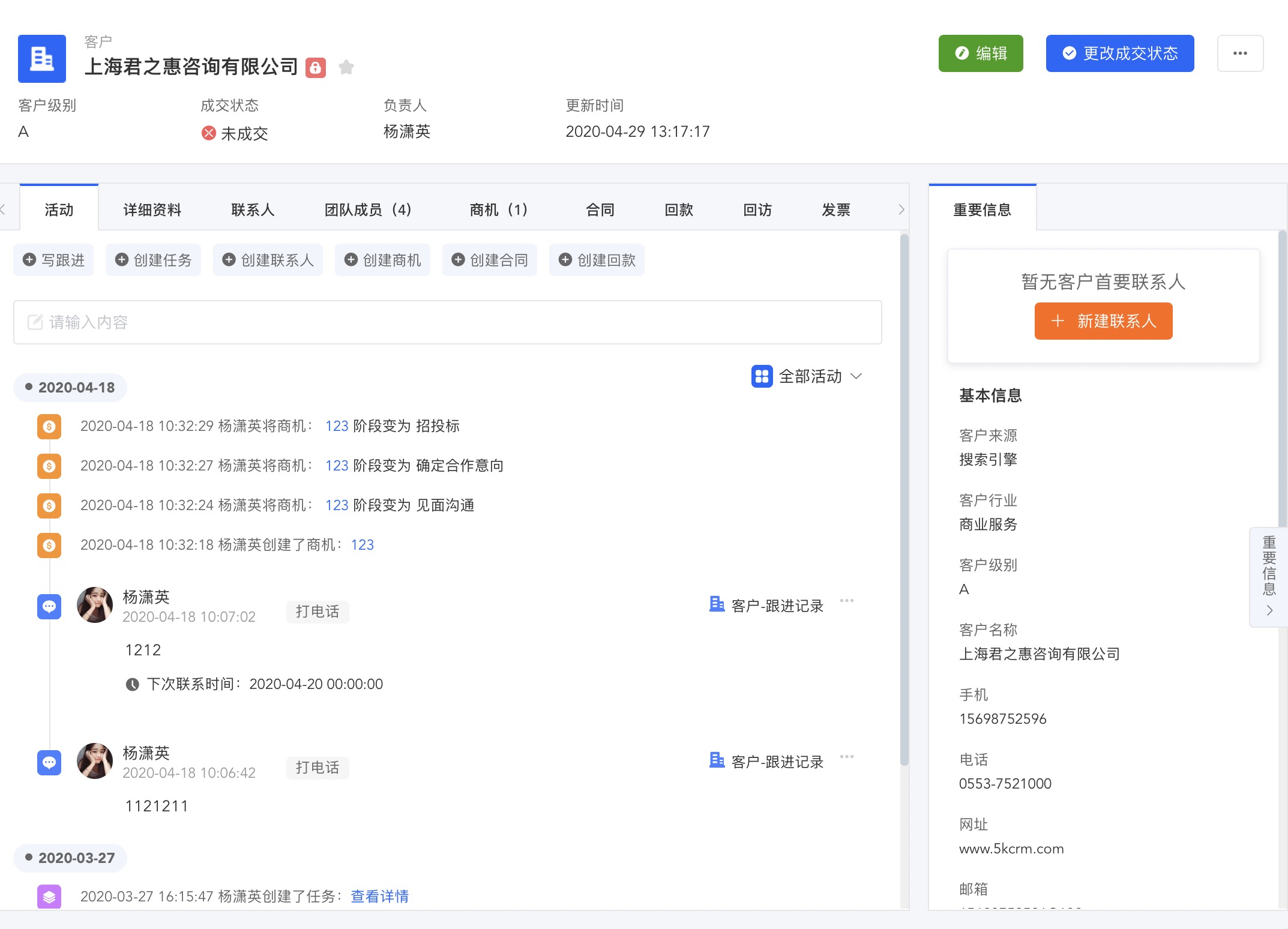 您可以随时在客户详情下记录客户活动数据。销售人员每次拜访客户沟通的信息、合同信息、商机信息会以时间轴的形式展现。当然您也可以对接呼叫中心,客户通话记录,通话录音也可以及时保存。