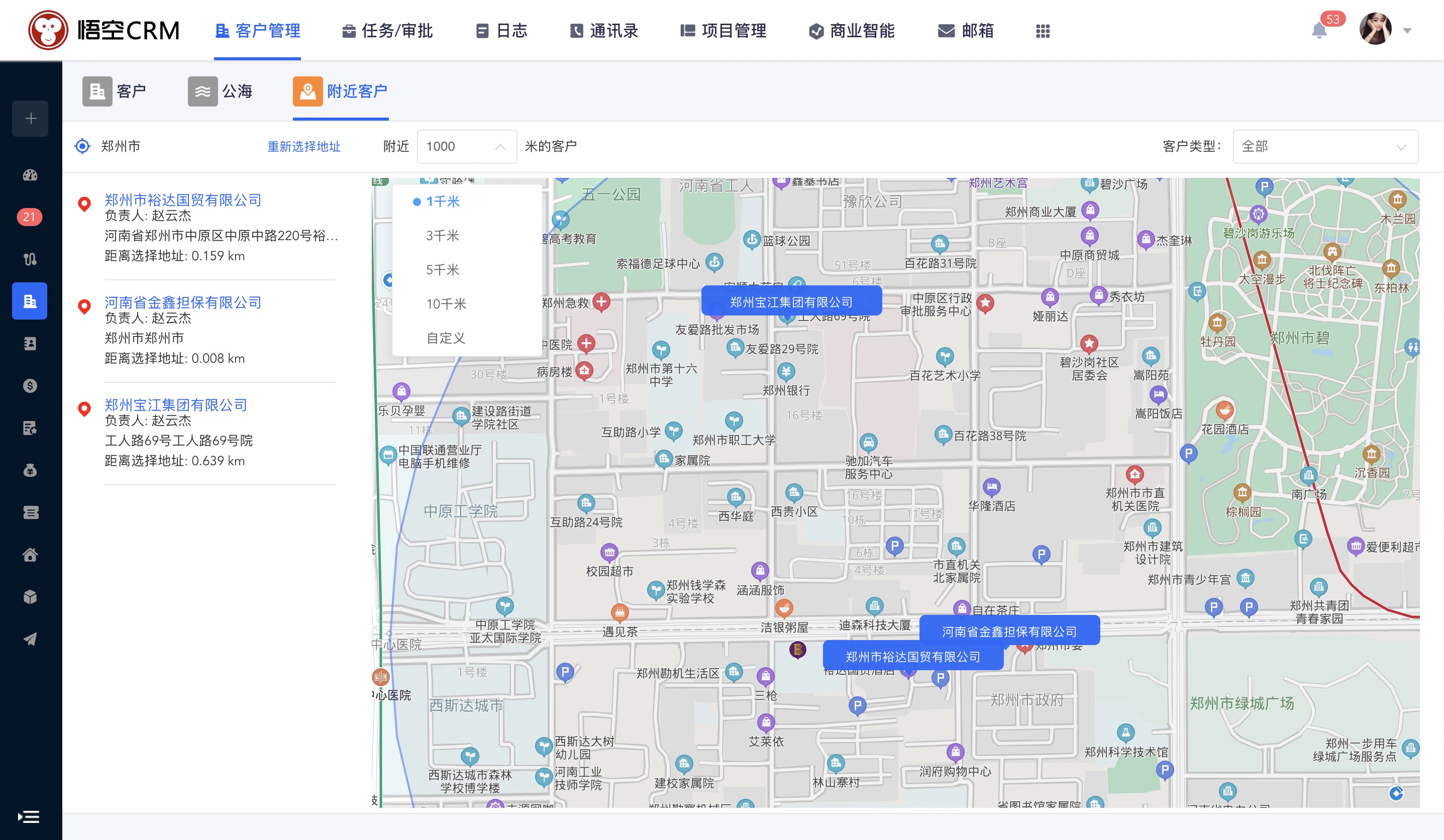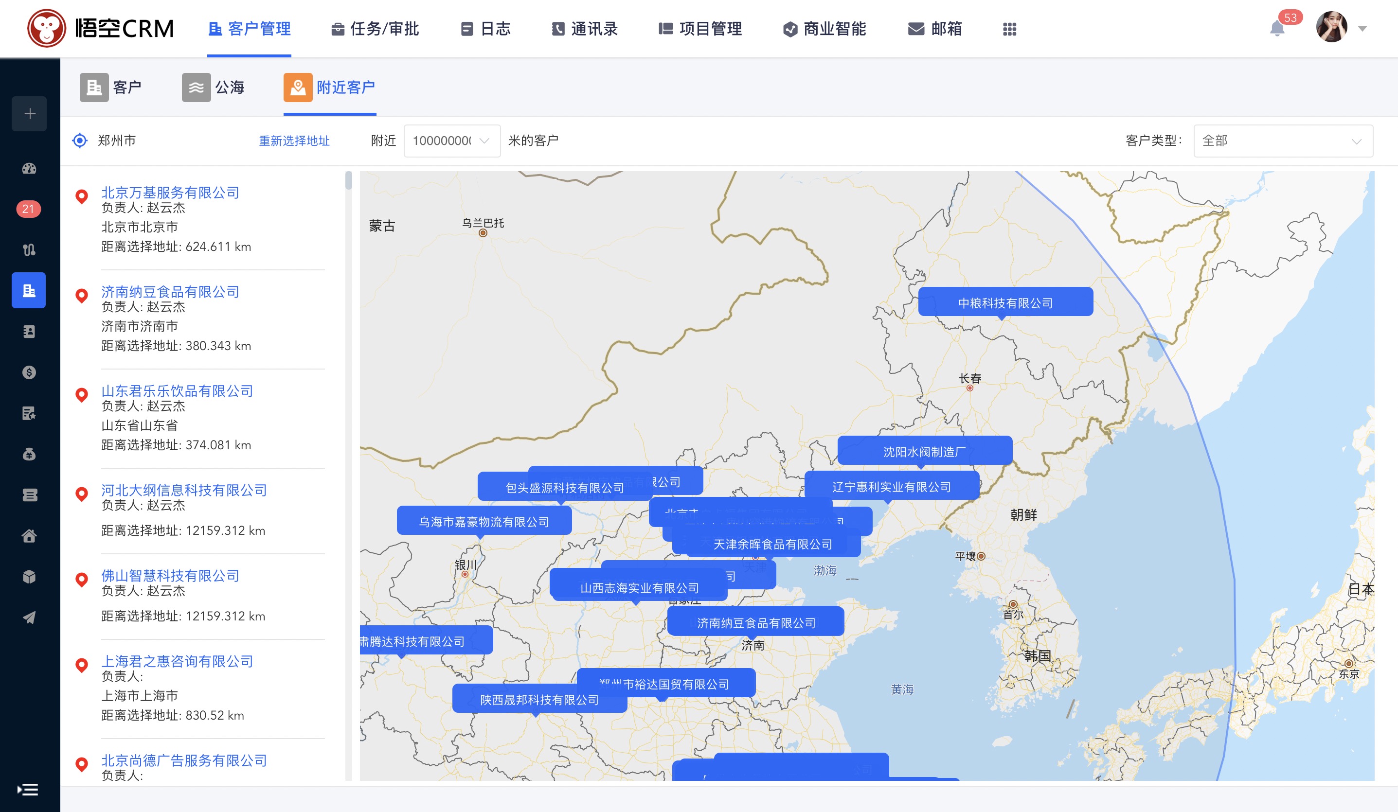 用户可通过悟空CRM的附近的客户功能查看到附近的客户