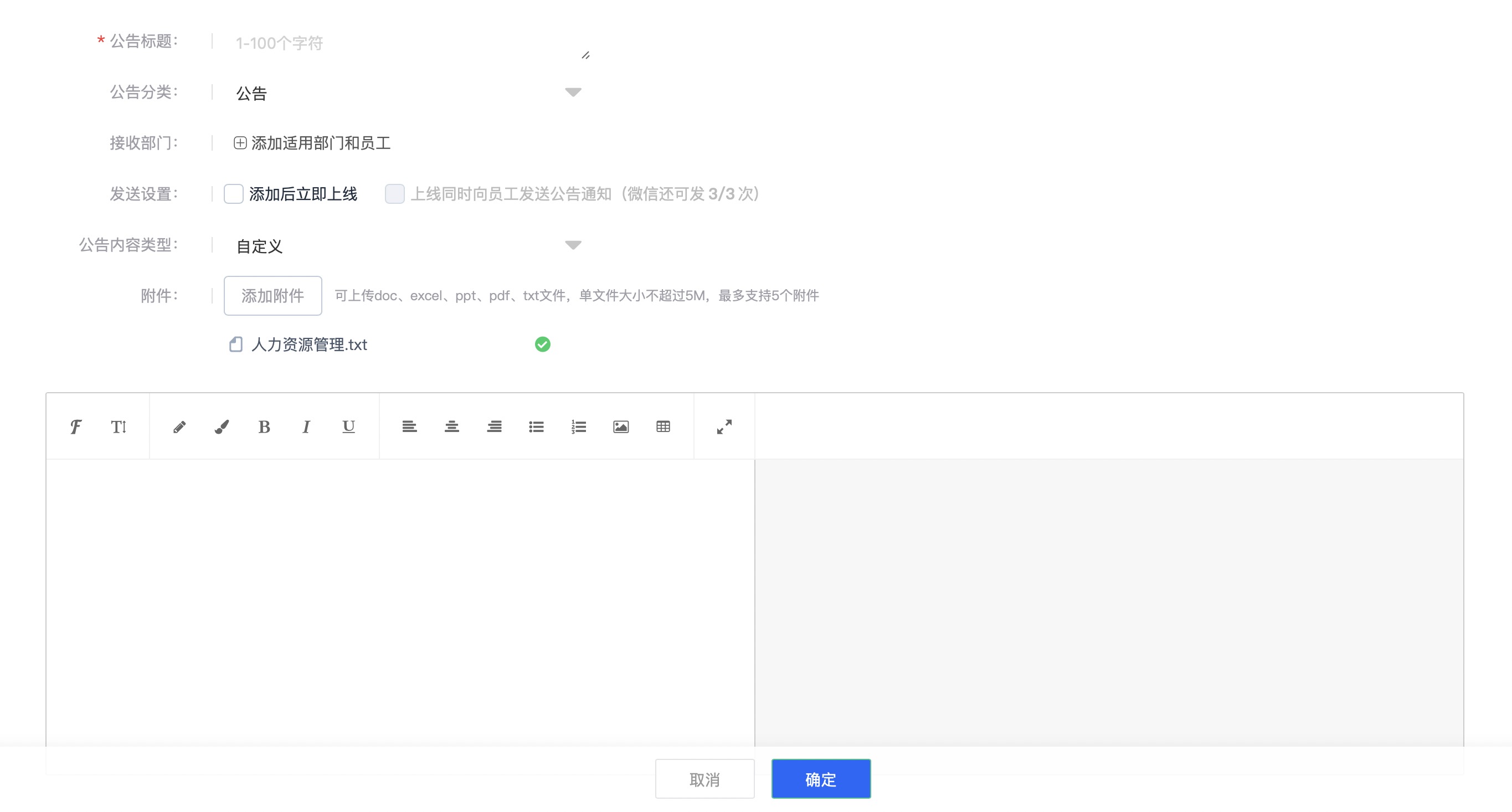 在线设置公告信息、可根据部门、员工多维度进行选择发送对象,收到对象会及时通知提醒。