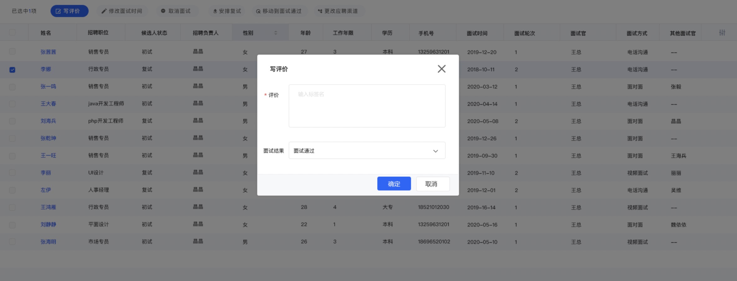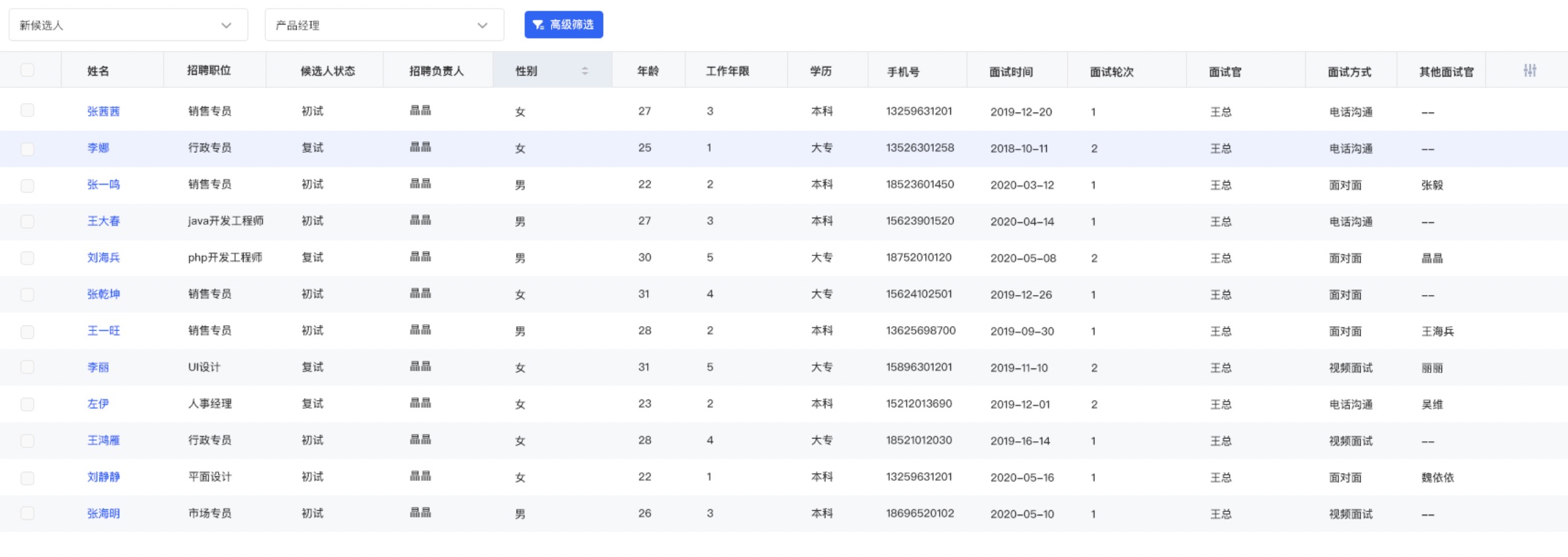 从面试开始到结束,全程把控面试进度,筛选合适的岗位候选人。